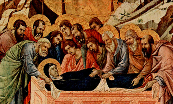 Погребение Пресвятой Богородицы В доме апостола Иоанна царит тишина и покой. Ничто не нарушает этой благоговейной атмосферы. Небольшая скромная комната освещена двумя рядами светильников, стоящих вокруг смертного одра. Можно было бы подумать, что в комнате никого нет, хотя на самом деле в ней в эту минуту собрано почти все Христово воинство. Здесь Его апостолы, только-только примчавшиеся со всех концов света, чтобы проводить Мать Учителя в Ее вечную обитель. Со склоненными головами стоят они вокруг одра Богородицы. А Она покоится. На Ее лице сияет отпечаток благости и какого-то таинственного счастья, свидетельствующего об отсутствии всякой скорби, а также последнее «Прощайте!», полное милосердия и снисхождения к сему миру. Священномученик Серафим (Чичагов) о материнской любви Божественный Страдалец, избегавший встретиться Своим взором с несчастной, горячо любимой и глубоко потрясенной голгофским зрелищем Матерью, обратил к Ней Свой окровавленный лик и, видя около Нее возлюбленнейшего ученика, не отходившего от Богоматери, произнес ласковым, сыновним, но тихим от страданий голосом: «Жено, се сын Твой!.. Се Мати твоя!»  «Се, Мати твоя» Какие это для нас всех драгоценные слова: «Се Мати твоя!» Столь близки они сердцу, понятны, утешительны всем верующим, скорбящим, страждущим, одиноким, нежно любящим Богоматерь, нуждающимся в Ее святой и чистой любви, в предстательстве пред Сыном Христом, в заступничестве, в помощи и поддержке. Се Мати наша! Может ли чья-либо любовь заменить чистую и святую любовь матери: и нет возраста, в котором бы человек не нуждался в материнских ласках, сочувствии, поддержке, помощи и научении. Поэтому, ведая человеческую беспомощность, потребности нашего сердца и бесчисленные скорби, Господь наш Иисус Христос усыновил Своих последователей в лице возлюбленнейшего ученика Своего Иоанна Преблагословенной Матери, Царице неба и земли, превознесенной превыше Херувимов и Серафимов, всесильной Заступнице и Молитвеннице, Споручнице грешных, дивной Скоропослушнице, Радости всех скорбящих, любвеобильнейшей из всех земных матерей. В этом еще раз сказалась беспредельная любовь Божия к человечеству. Буди имя Господне благословенно вовеки! Праведный Иоанн Кронштадтский о том, почему мы говорим «Успение» Братья, что это значит, что Церковь кончину Божией Матери называет не смертью, как обыкновенно мы называем кончину людей, а успением или, что все равно, упокоением или мирным сном? И не только не скорбит, не плачет при гробе Ее, а, напротив, поет радостные, торжественные песни Ее исходу? То, что преблагословенная Матерь Господа в самом деле не умерла, как обыкновенно умирают люди, а как бы уснула ненадолго мирным сном после тяжких скорбей жизни. Гроб Ее, бывший для Нее дверью к Небесному Царствию, скрывает в себе много радости для христианина; из этого гроба, как и из гроба воскресшего Господа, веет и на нас небесным нетлением, или лучше сказать — этот гроб непреложно обещает и нам бессмертие по душе и нетление по телу, истребляя в нас страх смерти. Будем же посильно побеждать в себе грех, как причину смерти. Побеждать грех только сначала весьма трудно, а потом будет и легко и сладостно, так как по мере увеличения страданий, причиняемых борьбой с грехом, будет увеличиваться и утешение Христово (2 Кор.1:5) в нас. И Господь, сказавш