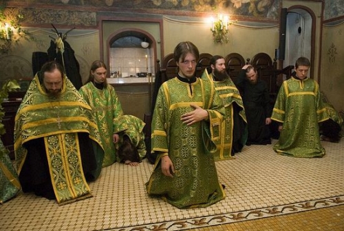 Коленопреклоненные молитвы в день Святой Пятидесятницы. Фото: Православие.Ru